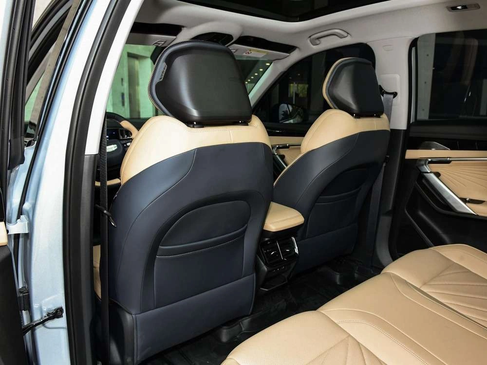 | Отделка интерьера и сидений тёмно-синей экокожей со светло-серыми вставками |